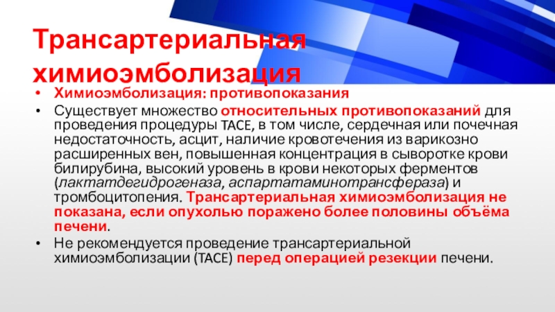расширенных вен, повышенная концентрация в сыворотке крови билирубина, высокий уровень в крови некоторых ферментов (лактатдегидрогеназа, аспартатаминотрансфераза) и тромбоцитопения. Трансартериальная химиоэмболизация не показана, если опухолью поражено более половины объёма печени.