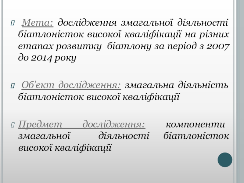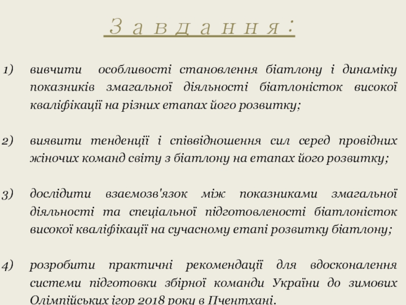 Тому актуальними є дослідження, присвячені вивченню особливостей змагальної діяльності біатлоністок високої кваліфікації у взаємозв'язку з реальним співвідношенням сил серед провідних команд світу з біатлону.