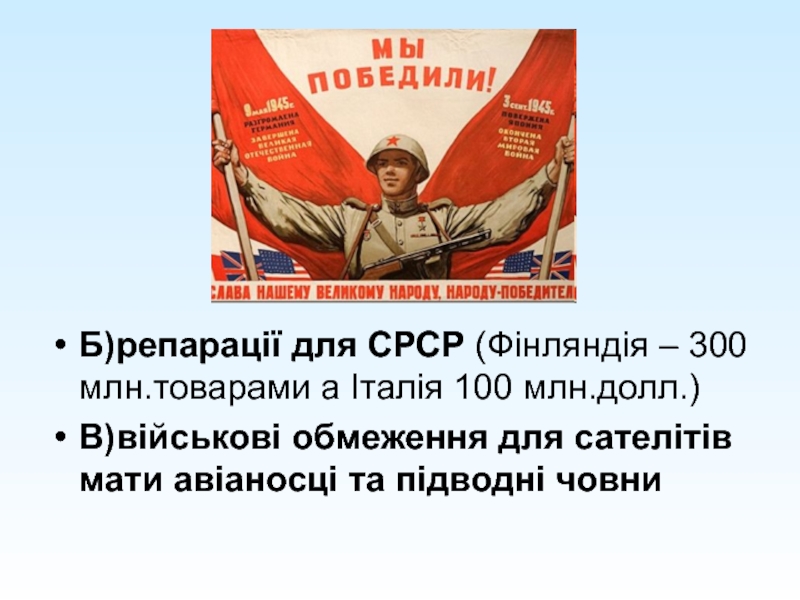 Слайд 10Б)репарації для СРСР (Фінляндія – 300 млн.товарами а Італія 100