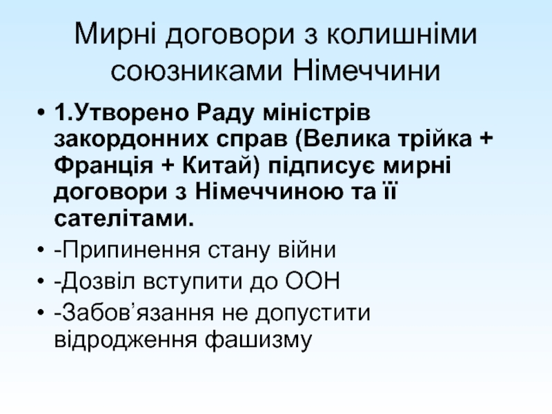 Слайд 8Мирні договори з колишніми союзниками Німеччини