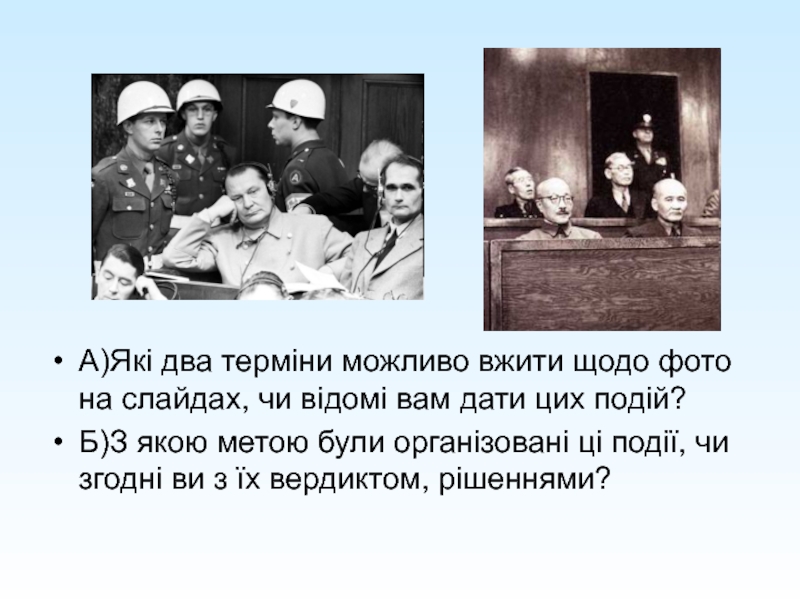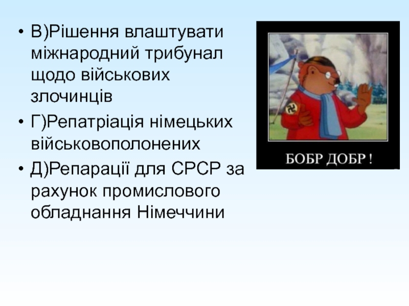 Слайд 7В)Рішення влаштувати міжнародний трибунал щодо військових злочинців