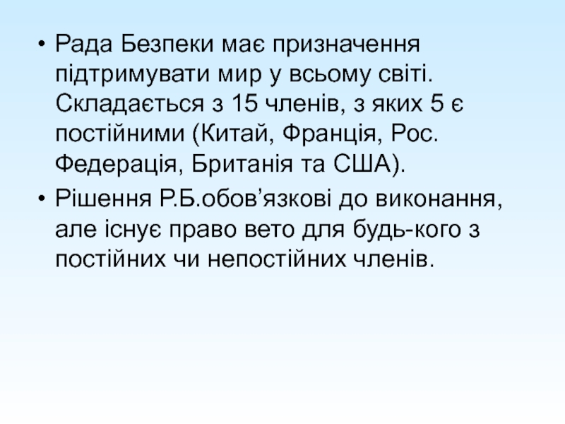 Слайд 14Рада Безпеки має призначення підтримувати мир у всьому світі. Складається
