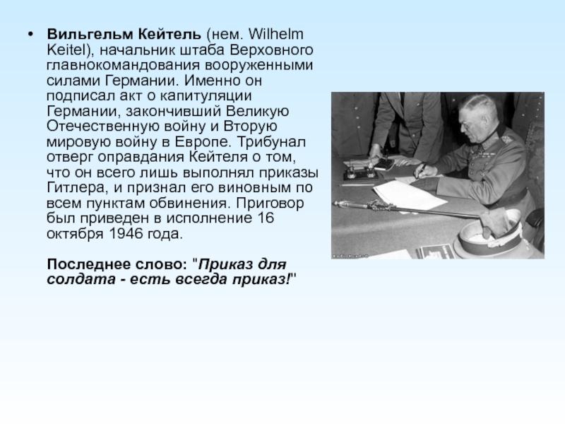 Великую Отечественную войну и Вторую мировую войну в Европе. Трибунал отверг оправдания Кейтеля о том, что он всего лишь выполнял приказы Гитлера, и признал его виновным по всем пунктам обвинения. Приговор был приведен в исполнение 16 октября 1946 года.