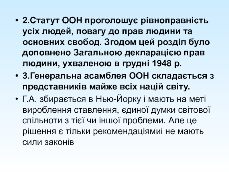 Слайд 122.Статут ООН проголошує рівноправність усіх людей, повагу до прав людини