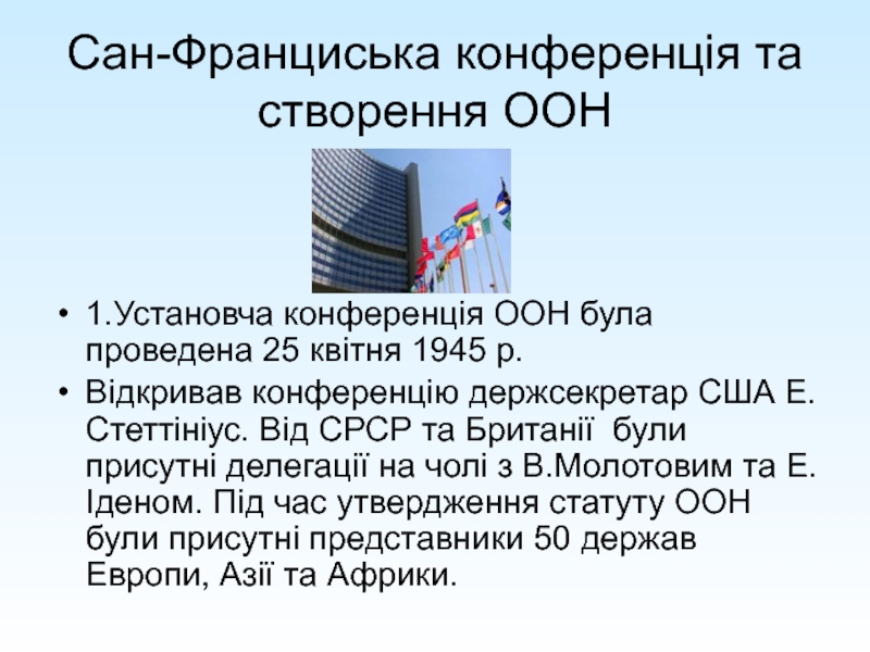 Британії були присутні делегації на чолі з В.Молотовим та Е.Іденом. Під час утвердження статуту ООН були присутні представники 50 держав Европи, Азії та Африки.