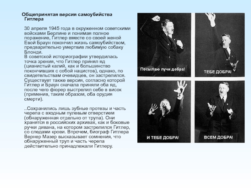 Слайд 21 Общепринятая версия самоубийства Гитлера