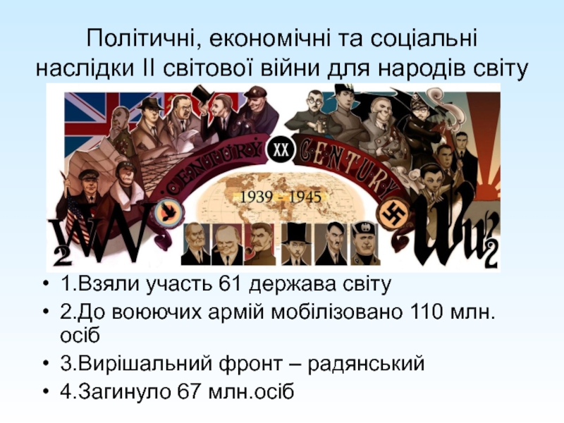 Слайд 2Політичні, економічні та соціальні наслідки ІІ світової війни для народів