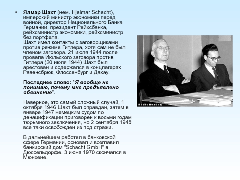 Слайд 20Ялмар Шахт (нем. Hjalmar Schacht), имперский министр экономики перед войной,