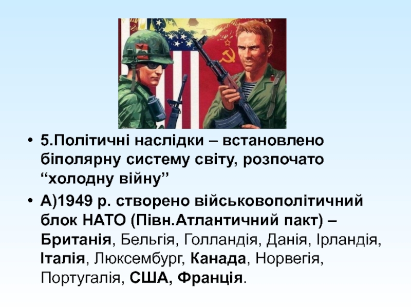 Слайд 35.Політичні наслідки – встановлено біполярну систему світу, розпочато “холодну війну”