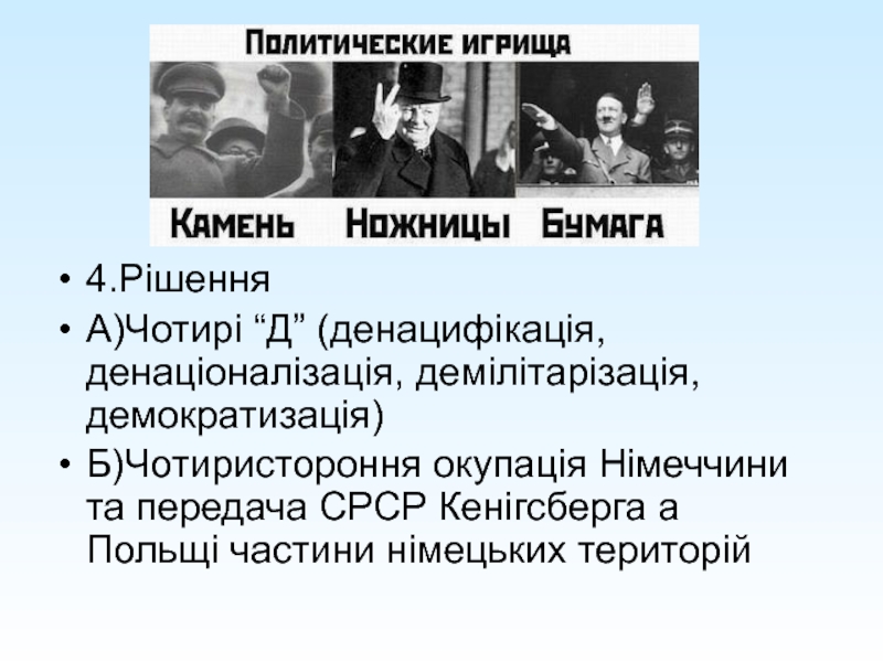 А)Чотирі “Д” (денацифікація, денаціоналізація, демілітарізація, демократизація)