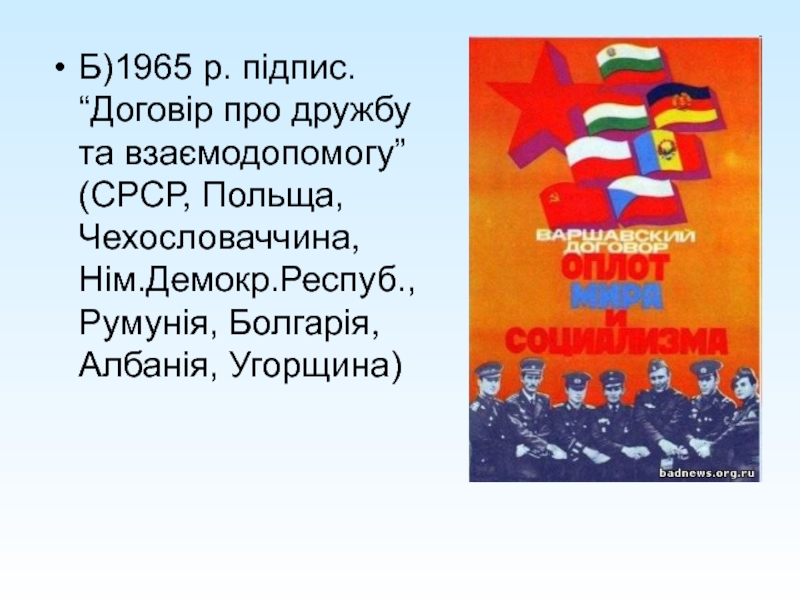 Слайд 4Б)1965 р. підпис. “Договір про дружбу та взаємодопомогу” (СРСР, Польща,
