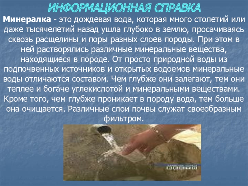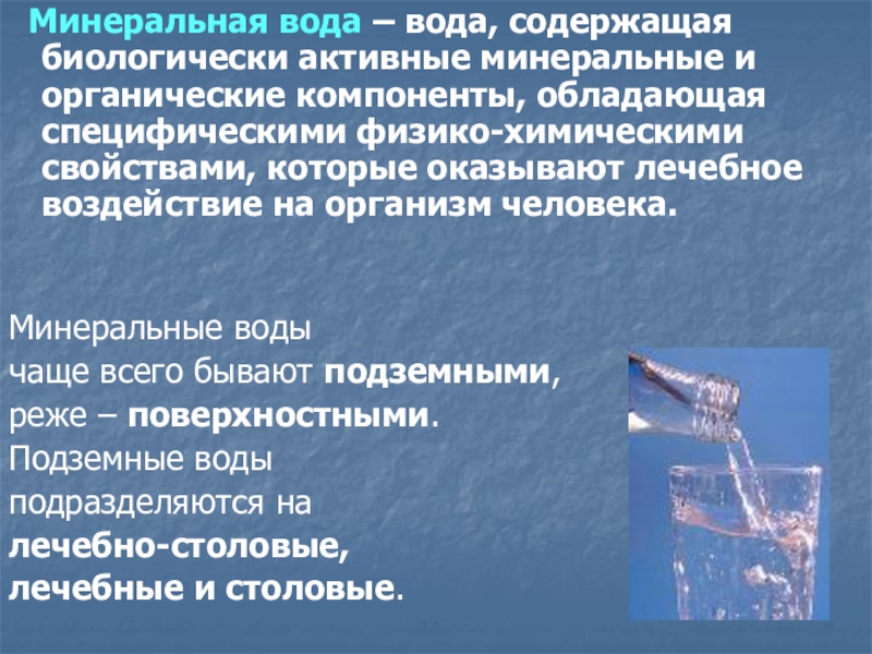 Слайд 2 Минеральная вода – вода, содержащая биологически активные минеральные и