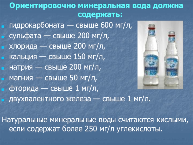 Слайд 7Ориентировочно минеральная вода должна содержать: