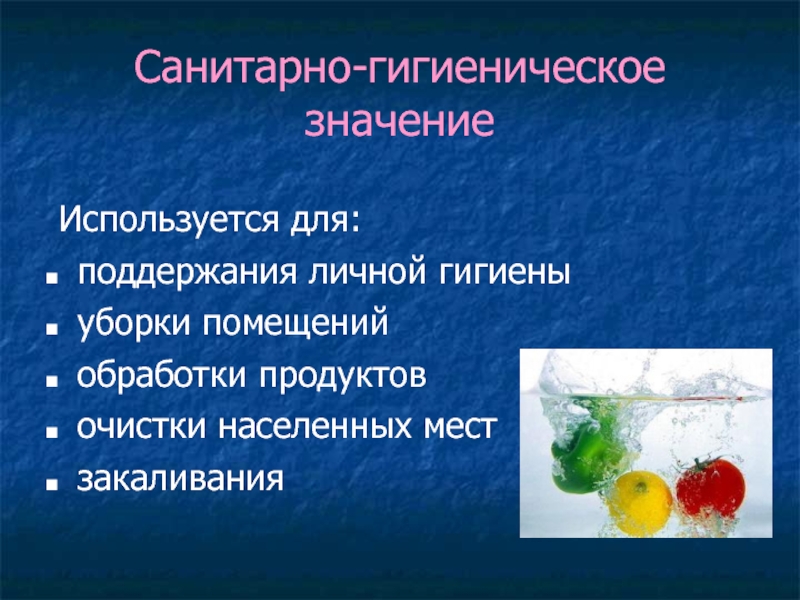 Санитарно-гигиеническое значение  Используется для:поддержания личной гигиеныуборки помещенийобработки продуктовочистки населенных местзакаливания