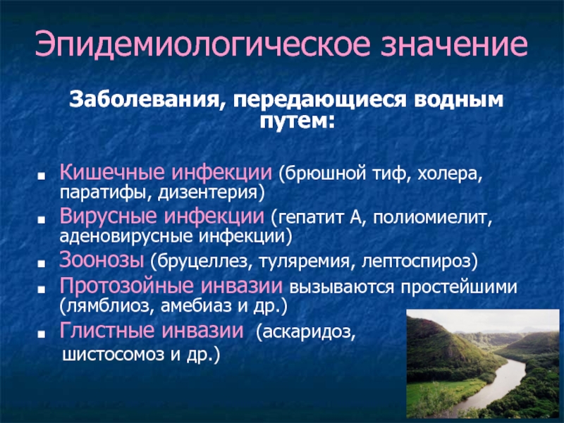 Эпидемиологическое значениеЗаболевания, передающиеся водным путем:Кишечные инфекции (брюшной тиф, холера, паратифы, дизентерия)Вирусные инфекции (гепатит А, полиомиелит, аденовирусные инфекции)Зоонозы