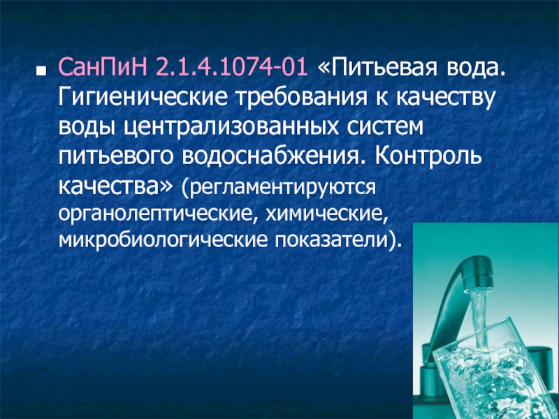 Слайд 12СанПиН 2.1.4.1074-01 «Питьевая вода. Гигиенические требования к качеству воды централизованных