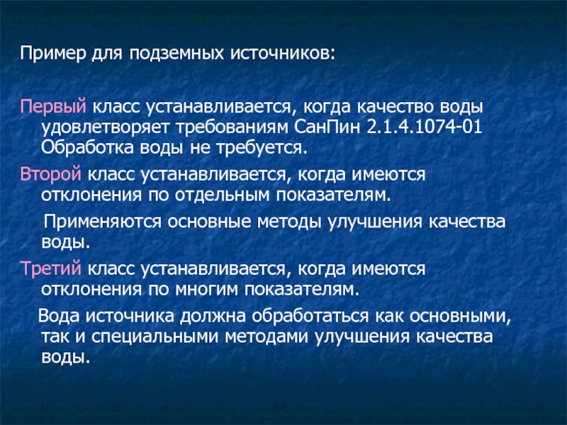 Пример для подземных источников:Первый класс устанавливается, когда качество воды удовлетворяет требованиям СанПин 2.1.4.1074-01 Обработка воды