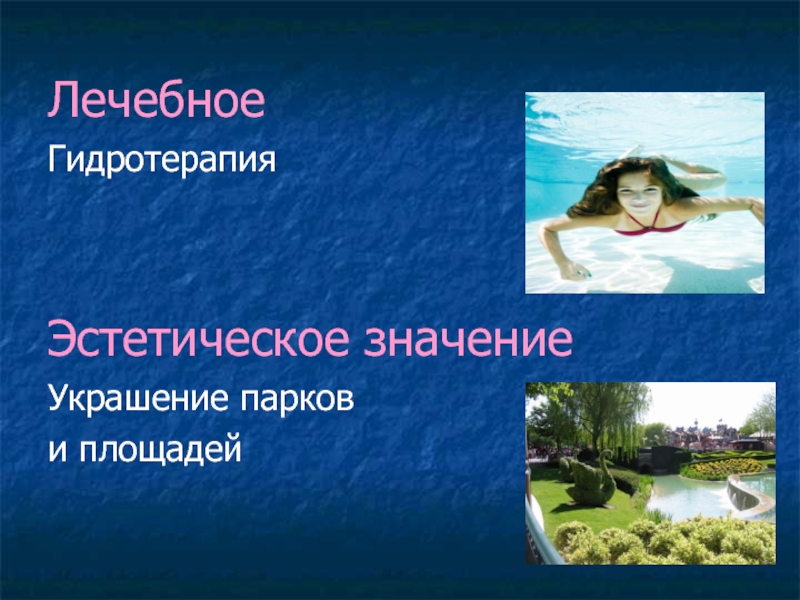 Лечебное ГидротерапияЭстетическое значениеУкрашение парков и площадей