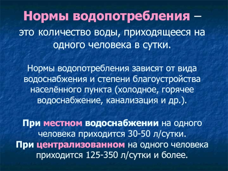 Нормы водопотребления – это количество воды, приходящееся на одного человека в сутки.  Нормы водопотребления зависят
