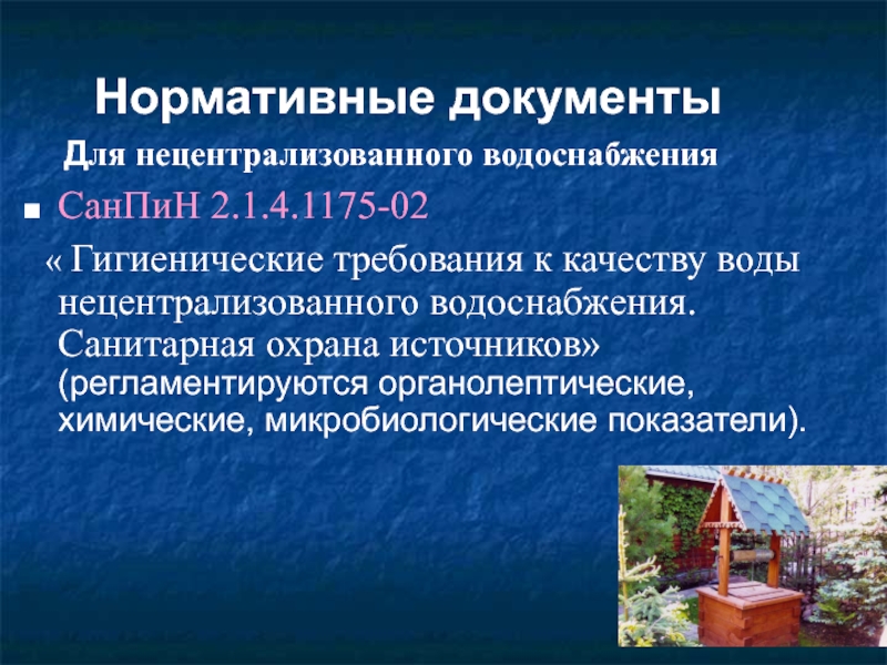 Нормативные документы  Для нецентрализованного водоснабженияСанПиН 2.1.4.1175-02  « Гигиенические требования к качеству воды