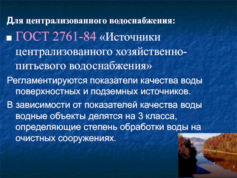 Для централизованного водоснабжения:ГОСТ 2761-84 «Источники централизованного хозяйственно-питьевого водоснабжения» Регламентируются показатели качества воды поверхностных и подземных