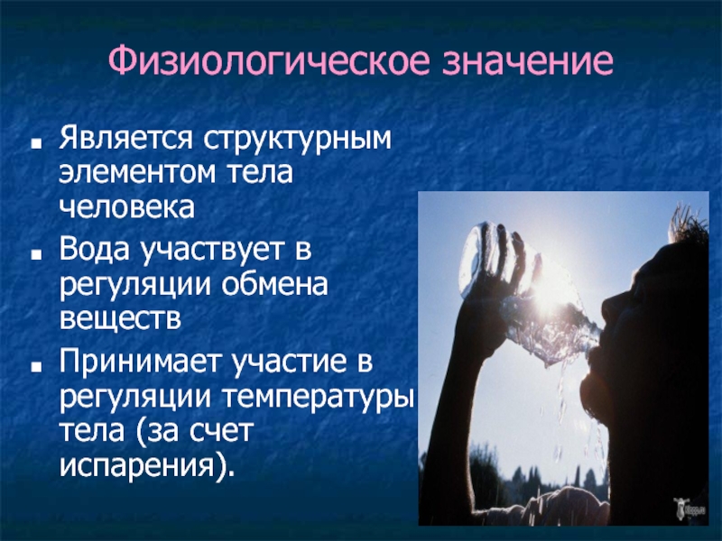 Физиологическое значение Является структурным элементом тела человекаВода участвует в регуляции обмена веществПринимает участие в регуляции температуры тела