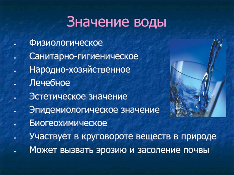 Значение водыФизиологическоеСанитарно-гигиеническоеНародно-хозяйственноеЛечебное Эстетическое значениеЭпидемиологическое значениеБиогеохимическоеУчаствует в круговороте веществ в природеМожет вызвать эрозию и засоление почвы