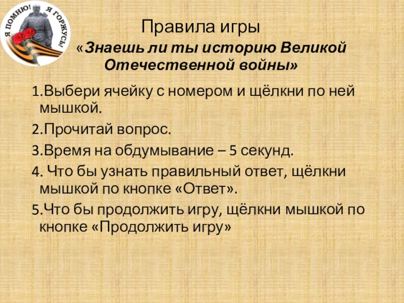 на обдумывание – 5 секунд.4. Что бы узнать правильный ответ, щёлкни мышкой по кнопке «Ответ».