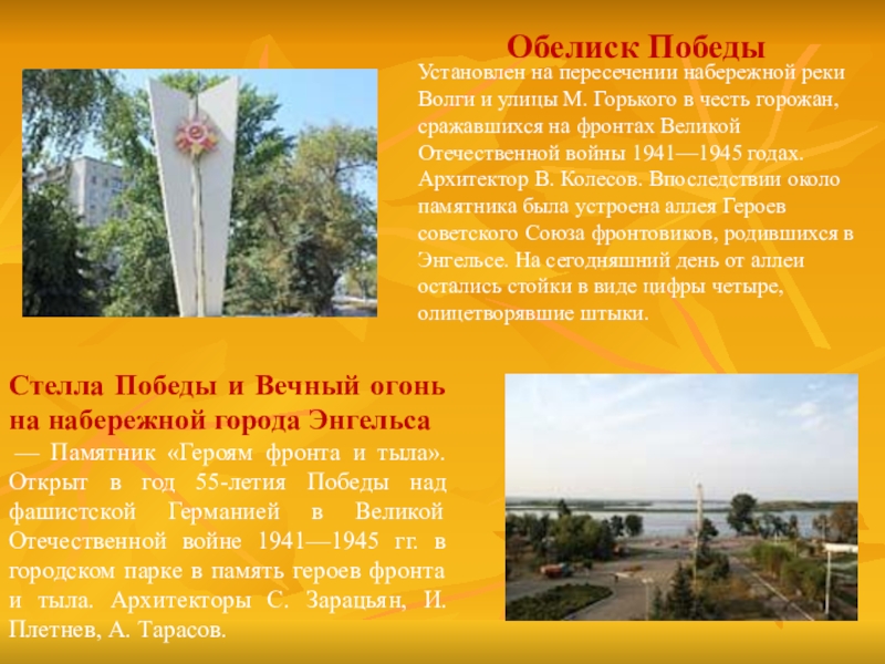 Стелла Победы и Вечный огонь на набережной города Энгельса