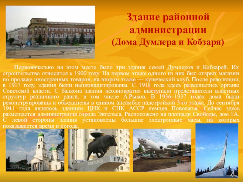 Энгельс основан в 1747 году (в 1914-1931 Покровск) . Переименован в честь Ф.Энгельса. Был столицей Автономной Республики Немцев Поволжья. Город расположен на левом берегу Волги, напротив г.Саратова, c которым соединен с 1965 года автодорожным мостом. Территория Энгельсского муниципального района 3,1 тысяча кв.км. Площадь Энгельса - 121,06 кв.км.