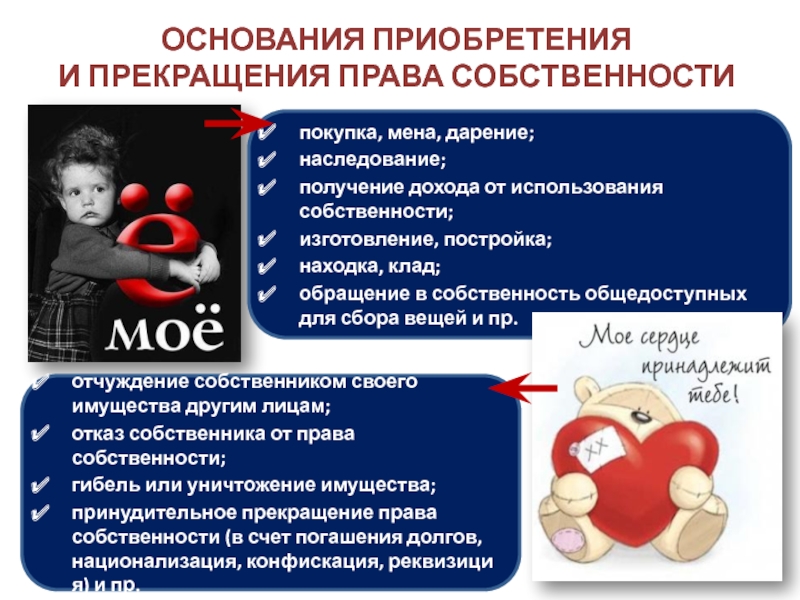 принудительное прекращение права собственности (в счет погашения долгов, национализация, конфискация, реквизиция) и пр.