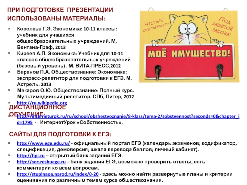 http://interneturok.ru/ru/school/obshestvoznanie/8-klass/tema-2/sobstvennost?seconds=0&chapter_id=1795 - ИнтернетУрок «Собственность».