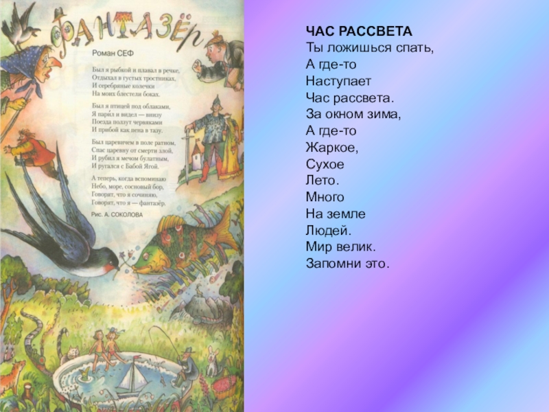 ЧАС РАССВЕТАТы ложишься спать,А где-тоНаступаетЧас рассвета.За окном зима,А где-тоЖаркое,СухоеЛето.МногоНа землеЛюдей.Мир велик.Запомни это.