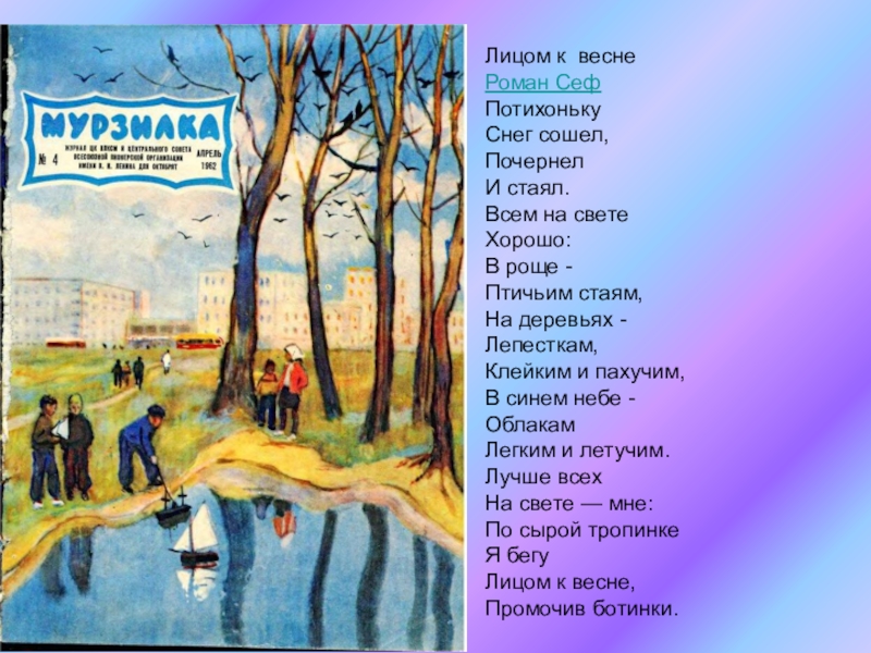 Лицом к весне Роман Сеф ПотихонькуСнег сошел,ПочернелИ стаял.Всем на светеХорошо:В роще -Птичьим стаям,На деревьях -Лепесткам,Клейким и пахучим,В синем небе -ОблакамЛегким и летучим.Лучше всехНа свете — мне:По сырой