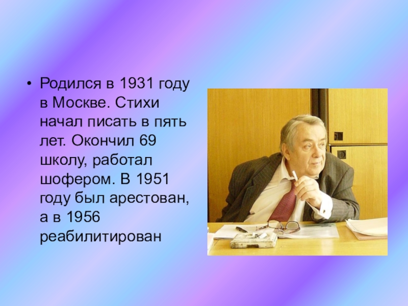Слайд 3Родился в 1931 году в Москве. Стихи начал писать в