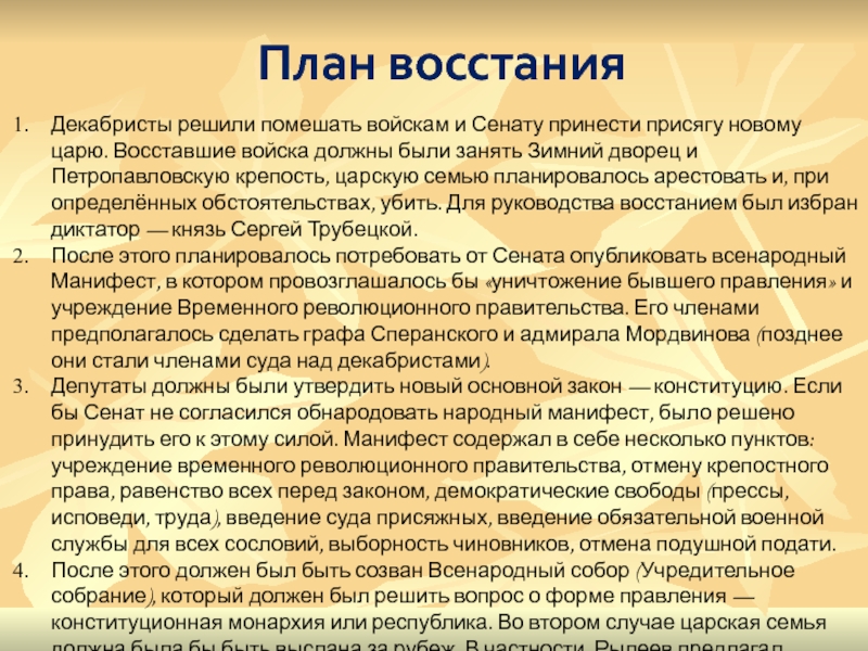 крепость, царскую семью планировалось арестовать и, при определённых обстоятельствах, убить. Для руководства восстанием был избран диктатор — князь Сергей Трубецкой.