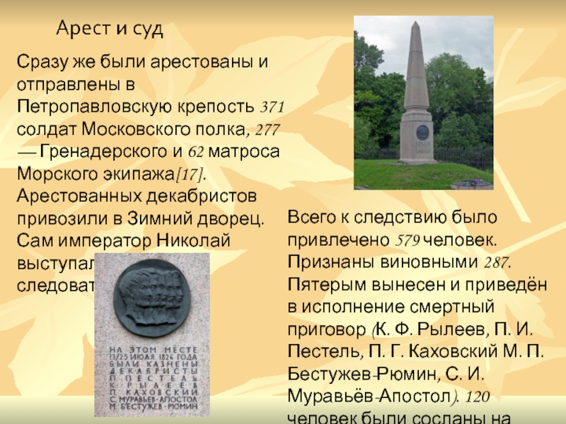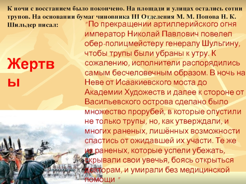 многие из них были офицерами гвардии. Они попытались использовать гвардейские части для недопущения вступления на трон Николая I. Целью было упразднение самодержавия и отмена крепостного права. Восстание разительно отличалось от заговоров эпохи дворцовых переворотов по своим целям и имело сильнейший резонанс в российском обществе, значительно повлиявший на общественно-политическую жизнь последовавшей за ним эпохи правления Николая I.