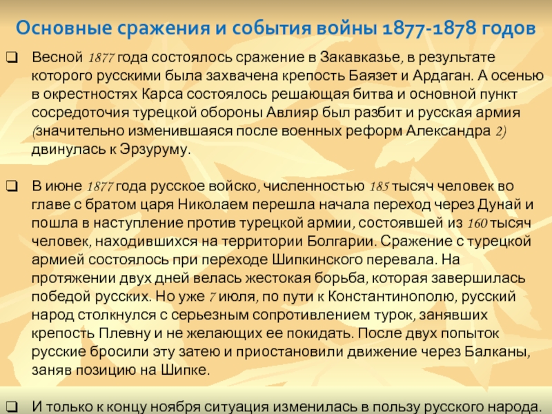 В июне 1877 года русское войско, численностью 185 тысяч человек во главе с братом царя Николаем перешла начала переход через Дунай и пошла в наступление против турецкой армии, состоявшей из 160 тысяч человек, находившихся на территории Болгарии. Сражение с турецкой армией состоялось при переходе Шипкинского перевала. На протяжении двух дней велась жестокая борьба, которая завершилась победой русских. Но уже 7 июля, по пути к Константинополю, русский народ столкнулся с серьезным сопротивлением турок, занявших крепость Плевну и не желающих ее покидать. После двух попыток русские бросили эту затею и приостановили движение через Балканы, заняв позицию на Шипке.