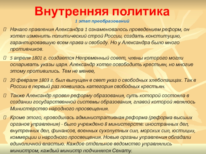 Начало правления Александра 1 ознаменовалось проведением реформ,