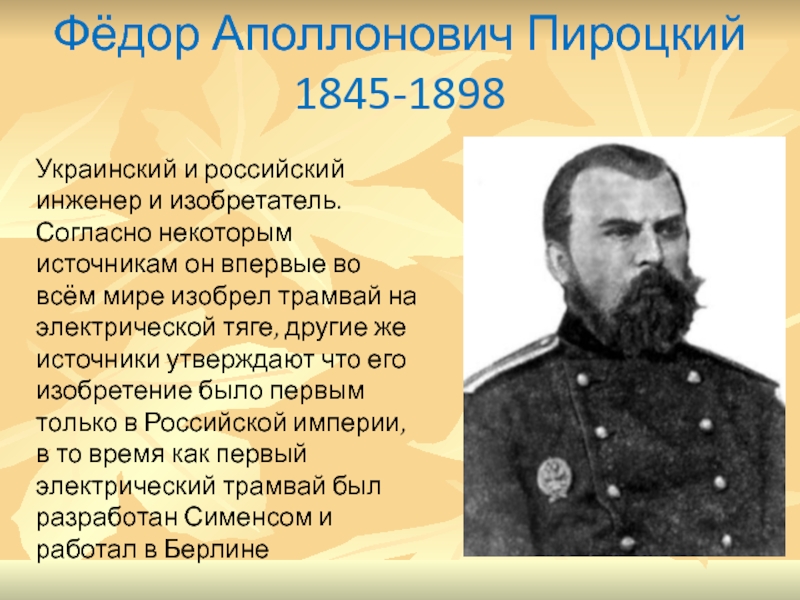 тяге, другие же источники утверждают что его изобретение было первым только в Российской империи, в то время как первый электрический трамвай был разработан Сименсом и работал в Берлине