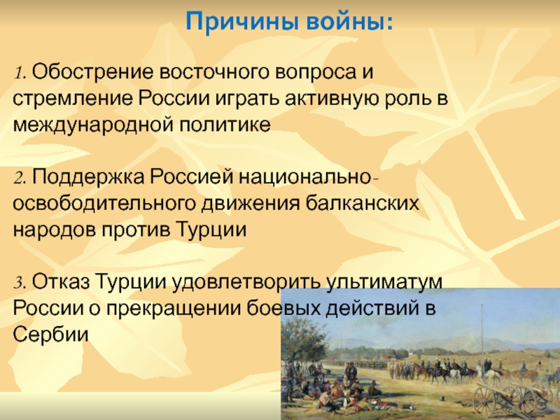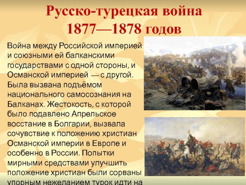 другой. Была вызвана подъёмом национального самосознания на Балканах. Жестокость, с которой было подавлено Апрельское восстание в Болгарии, вызвала сочувствие к положению христиан Османской империи в Европе и особенно в России. Попытки мирными средствами улучшить положение христиан были сорваны упорным нежеланием турок идти на уступки Европе, и в апреле 1877 года Россия объявила Турции войну.