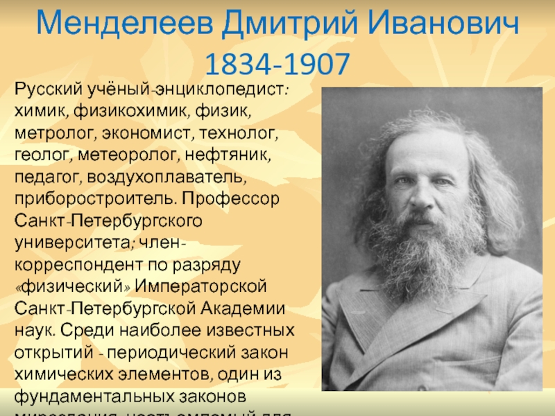 по разряду «физический» Императорской Санкт-Петербургской Академии наук. Среди наиболее известных открытий - периодический закон химических элементов, один из фундаментальных законов мироздания, неотъемлемый для всего естествознания. Автор классического труда «Основы химии».