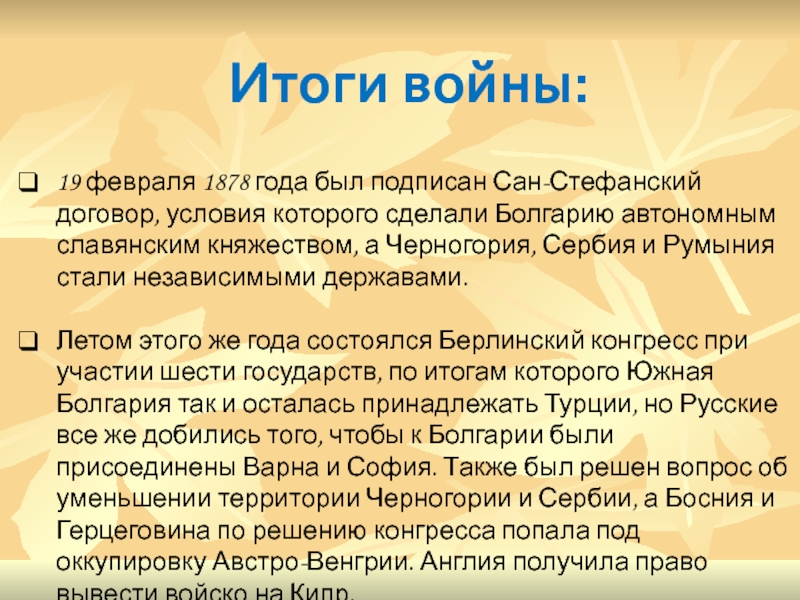 которого сделали Болгарию автономным славянским княжеством, а Черногория, Сербия и