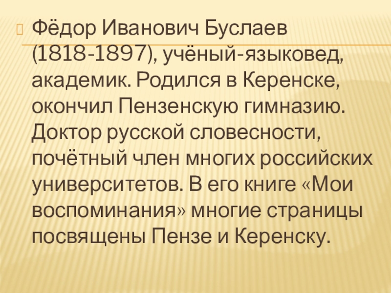 Слайд 7Фёдор Иванович Буслаев (1818-1897), учёный-языковед, академик. Родился в Керенске, окончил