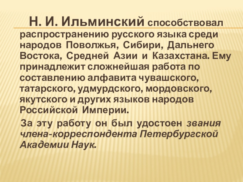 Слайд 14 Н. И. Ильминский способствовал распространению русского языка