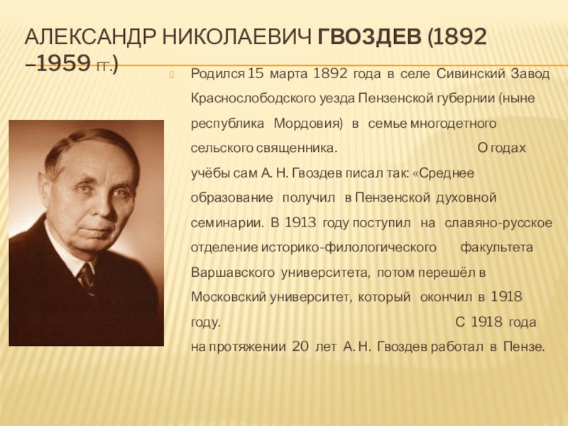 республика Мордовия) в семье многодетного сельского священника. О годах учёбы сам А. Н. Гвоздев писал так: «Среднее образование получил в Пензенской духовной семинарии. В 1913 году поступил на славяно-русское отделение историко-филологического факультета Варшавского университета, потом перешёл в Московский университет, который окончил в 1918 году. С 1918 года на протяжении 20 лет А. Н. Гвоздев работал в Пензе.