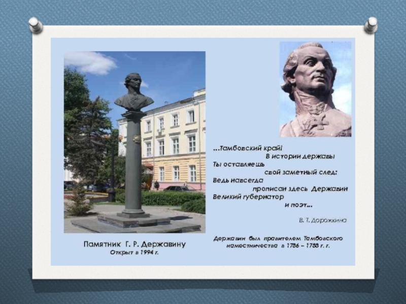 Державин Гавриил Романович Русский поэт. Российский государственный деятель, министр юстиции В 1786-1788 годах был Тамбовским губернатором