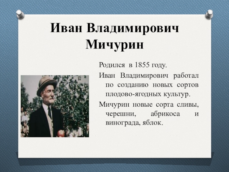 Иван Владимирович МичуринРодился в 1855 году.Иван Владимирович работал по созданию новых сортов плодово-ягодных культур.Мичурин новые сорта сливы,