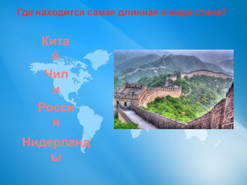 Где находится самая длинная в мире стена?КитайЧилиРоссияНидерланды