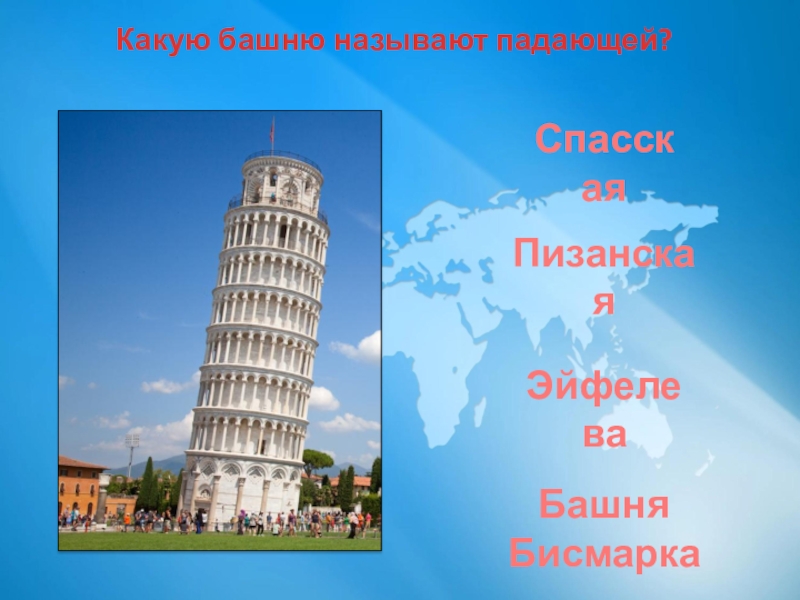Какую башню называют падающей?СпасскаяПизанскаяЭйфелеваБашня Бисмарка